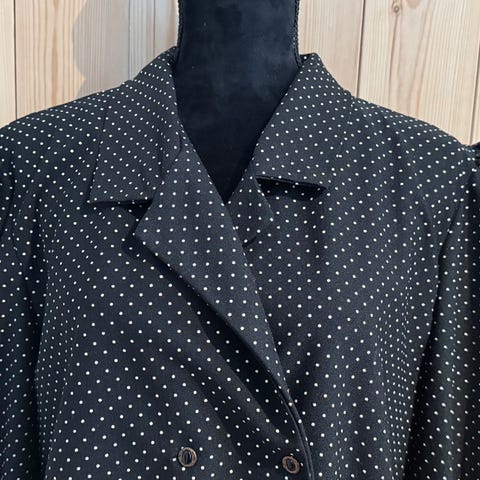 Fin ubrukt retro pysjamas fra Lindex, inspirert av 1930-tallets stil. Bukse og jakke med fjær som kan knappes av. Jakken har knapper foran og fin krave, buksen har strikk og snor i livet og to lommer. 52% resirkulert polyester, 48% viskose. Ny pris kr 800.