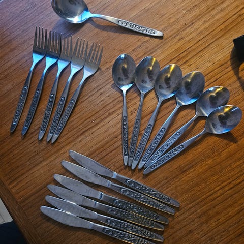 Skaugum bestikksett bestående av 31 deler i rustfritt stål. Settet inkluderer 7 gafler, 12 kniver, 8 spiseskjeer, 1 teskje og 3 serveringsredskaper. Designet for daglig bruk og egnet for ulike måltider.