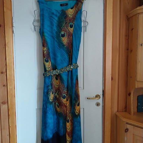 Kjolen har lange ermer, skulderputer og dekorativ knute foran, åpent mageparti, men med lange og brede sjal som kan knytes på forskjellige måter, også slik at mage/ryggparti blir helt dekket. Liten glidelås bak. Mykt, stretchy og tungt stoff som faller veldig pent.