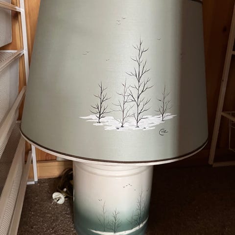 Vintage bordlampe med lampeskjerm i sateng med gullfrynser.