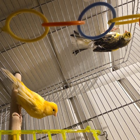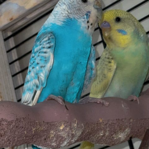 Et undulatpar hun og han, ca 4/5 år gamle. Den blå/grønne er gutt og heter Sonic. Den gule er ei jente og heter Gulli. Selges sammen, da de er kjærester. Følger med bur, masse utstyr, en rugekasse og en god del mat. De flyr ute hver dag og finner sjøl tilbake til buret, der de har sin mat og sine yndlings soveplasser, hver sin gynge. De er ikke håndtamme, men med tålmodighet og hirsfrø har de stort potensial til å bli det. (Bare bur + utstyr + mat har verdi ca 5000 kr)