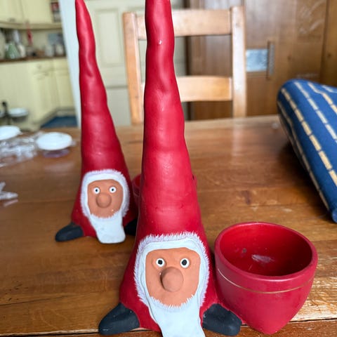 Nissefigur i hvit og gull farge. Dekorasjonen har detaljer i stoff og pelslignende materiale, og inkluderer en liten sekk med tilbehør. Passer som dekorasjon i julesesongen. Merke er ikke riktig. KI blandet seg inn så jeg måtte bare velge noe.