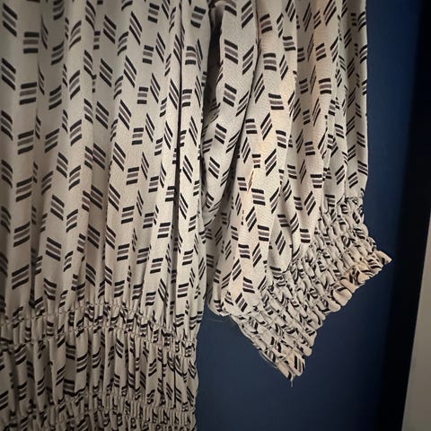 Leveté Room festkjole i størrelse M, laget av polyamid og metalltråd. Kjolen har lang erm, med rynkedetalje og puffermer.