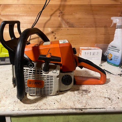 Selger komplett Stihl 025 sag med 4 ekstra kjeder, da den ikke lenger blir brukt.
