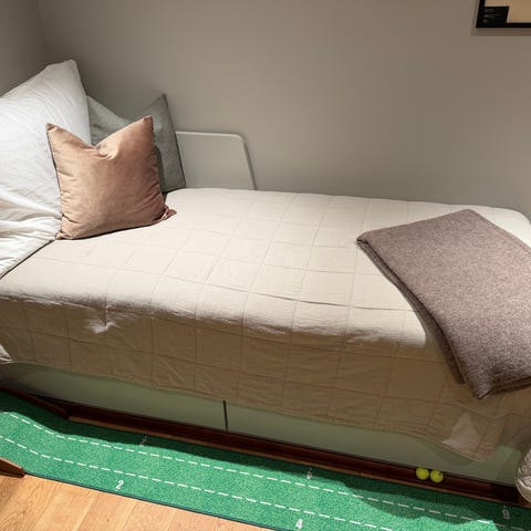 Sengen har ingen synlige bruksmerker og kan veldig enkelt slås ut til dobbeltseng.