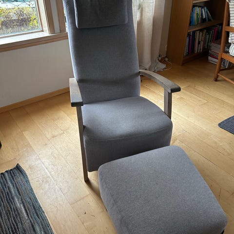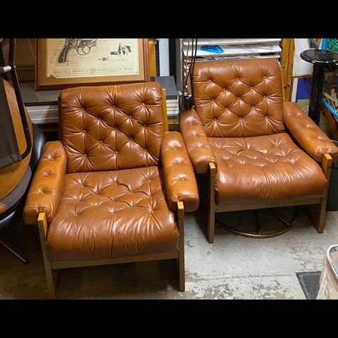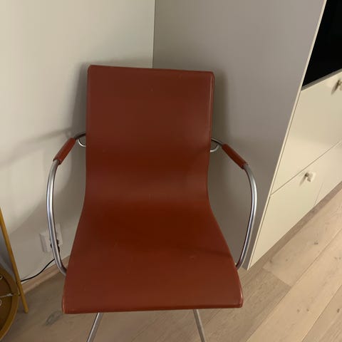 Nydelig vintage skinnstol. Jeg har kjøpt denne brukt, stelt den med vask og skinnrens. Har preg av alle sine år, fremdeles supert å sitte i.