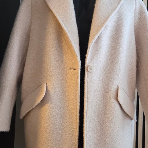 Kåpe med 50% ull, offwhite/ beige med gullfargede glidelåser. Nyvasket og klar for ny eier, selges da den er for fin til å bli hengende i skapet. Passer til hverdag og fest.
