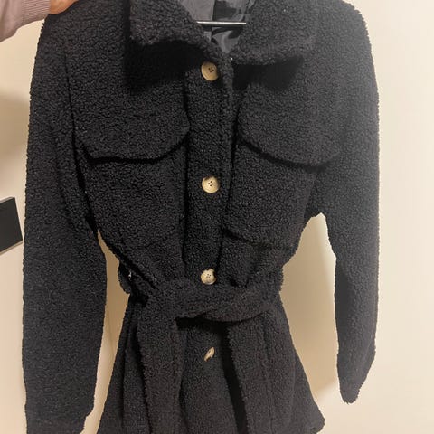 Blandingsmateriale som også inneholder ull, god og varm. Høy hals/ krage.