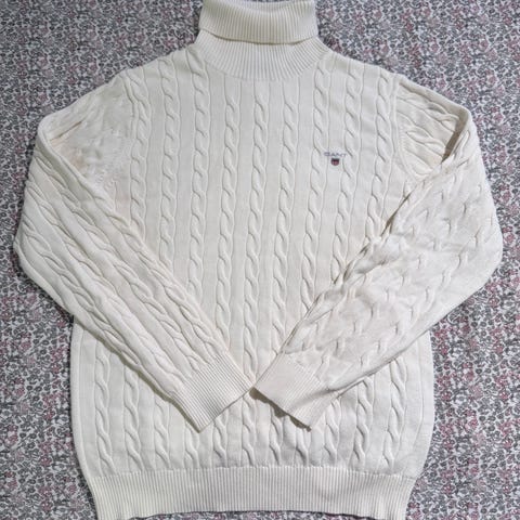 GANT genser i hvit farge, laget av bomull, størrelse L for herre. Genseren har kabelstrikket mønster og rund høy hals.