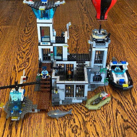 LEGO Spider-Man LEGO-sett med flere minifigurer og en bygning med tilhørende detaljer som brygge, trapp, og vannområde. Settet inkluderer figurer av Spider-Man og andre karakterer, samt en mekanisk innretning inne i bygningen. Slitt byggeanvisning uten eske.