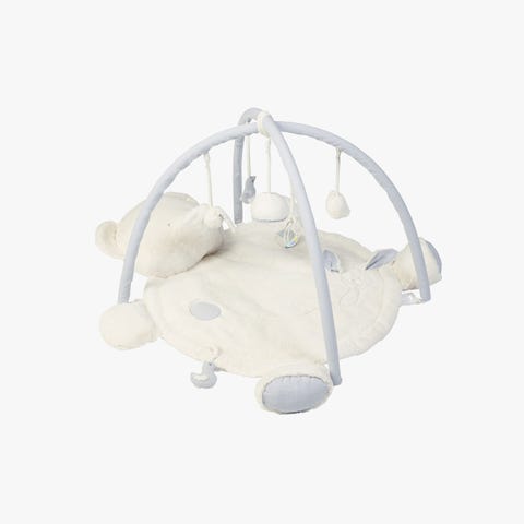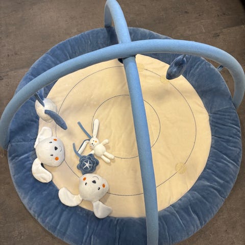 Pent brukt babygym fra Ingenuity med rangler, biteleker, speil og pute. Trekket er nyvasket, kan brukes begge veier (se bilde for grønn side), og er enkelt avtagbart. Praktisk at alt kan tas fra hverandre og bæres sammenbrettet. Det er flere hull slik at det også kan fylles opp med andre favorittleker. Den ene biteleken har en løs tråd som enkelt kan sys, og det er en litt løs flis under det ene festet for leker som kan limes/tas av (se bilder).