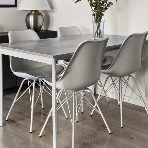 Selger 4 spisestoler fra Bohus. Stolene har svartlakkerte trebein og grå pute.