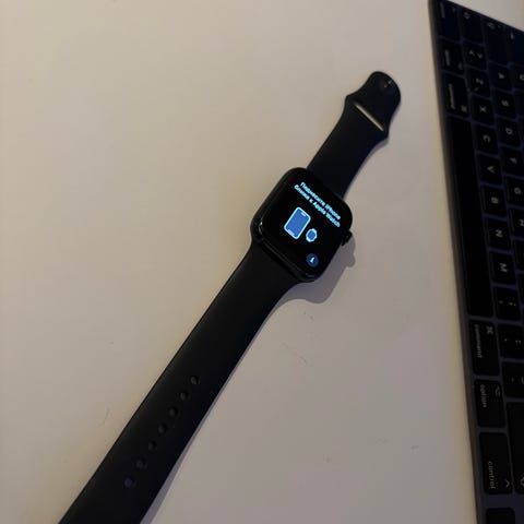 Apple Watch Series 9smartklokke med svart rem. En smartenhet designet for å brukes på håndleddet, med funksjoner for helseovervåking, meldinger og apper.