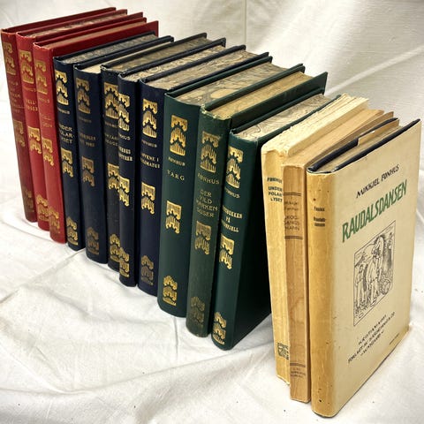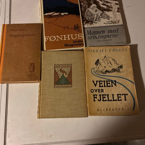 13 av 15 romaner av Fønhus fra perioden 1936-59. Alle er originalutgaver. Se vedlagt liste. Selges samlet. Porto kommer i tillegg. Se også lot #1 og #3 for øvrige Fønhus romaner.