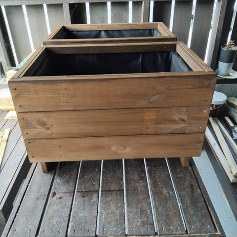 3 STK STORE HJEMMELAGDE BLOMSTERKASSER LAGET AV IMPREGNERT MATERIALE FERDIG BEISET MED FIBERDUK KLAR TIL BRUK
