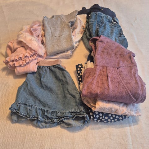 Liten klespakke bestående av 2 bukser, 2 gensere og en collegejakke