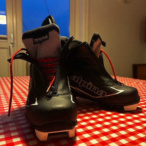 Alpina skisko i svart farge med snøring. Egnet for bruk i langrenn eller skiaktiviteter.