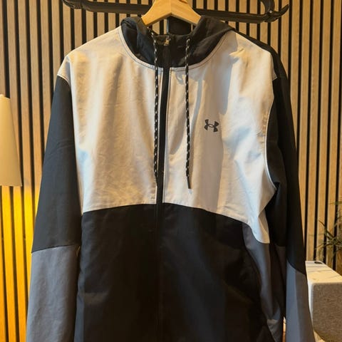 Under Armour jakke for herre i størrelse M. Jakken er i grå farge og egnet for fitnessaktiviteter. Den har hette og glidelås foran. Materialet er designet for å gi komfort og funksjonalitet under trening. Perfekt jakke til og fra trening på høst/vinter, også til treningsturer og gåturer nesten ikke brukt da den ble hakke for stram. Normal i størrelsen, , pris kan diskuteres ved hurtig avgjørelse. Nypris 1399