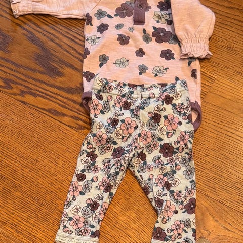 Pent brukt ullsett bestående av body og stilongs til jente. Settet er fra Name it. Overdelen er lilla, buksen er hvit med blomster.