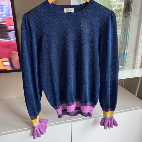 Fin genser med glitrende sølvtråder, fra Baum und Pferdgarten, str.L, pent brukt. Laget av 99% bomull og 1% angelina("sølvtrådene"?). Kan sende🌿
