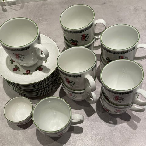 Porsgrund servise med et fargerikt mønster. Inneholder flere kopper, skåler og tallerkener i porselen. Passer til daglig bruk og samlinger.