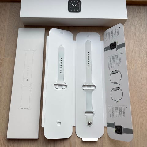 Apple Watch Series 4 smartklokke med beige silikonrem. Inkluderer lader med magnetisk ladeplate. Batteri prosent 98%.