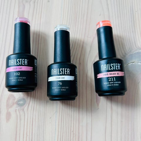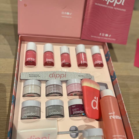 11 farger med lite brukt DIPSY pulver ( 3 farger er brukt mer, men over 50% igjen) selges sammen med skål til å fjerne neglelakken med. Denne fungerer godt og har rester av gammel lakk på seg. Restene av base cote og activator følger med, men disse må fornyes.
