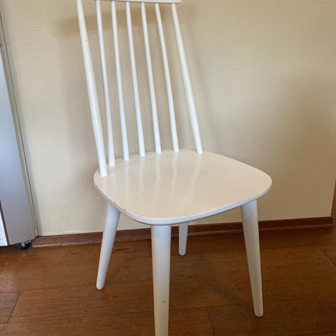 Kjøkkenstoler i hvit hardplast og ben i lyst tre. En av stolbena er reparert og fungerer greit. Solide stoler.