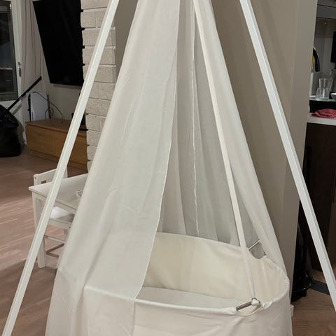 Leander vugge for barn, designet for å gi en trygg og komfortabel soveløsning. Laget i hvitt materiale, egnet for bruk i barnerom.