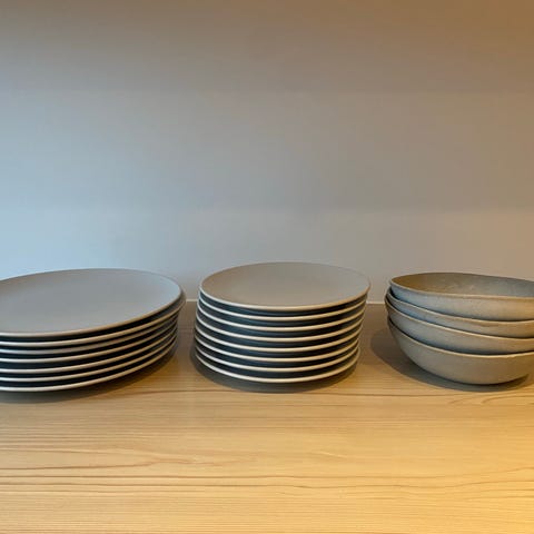 Pent og enkelt servisesett fra IKEA i nøytrale farger (grå og hvit).