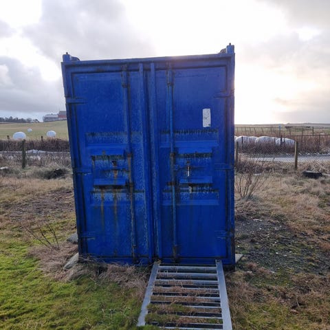 Offshore kontainer brukt til bygglager, godt brukt men med mye stål igjen enda om mann treng ett vanntett og låsbart lager på byggeplass etc.