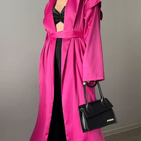 Rosa kimono med tilbehør i størrelse L for kvinner. Plagget har tradisjonelt mønster og er laget i et lett stoff som passer til formelle og kulturelle anledninger. Kimonoen har lange ermer og et løst, åpent snitt. Plagget har aldri vært i bruk.