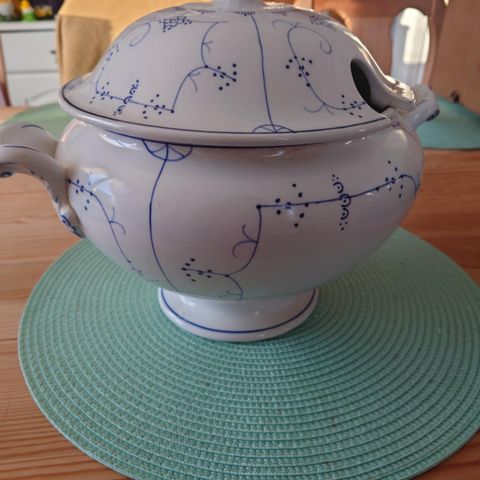 Suppeterrin selges. Sannsynlig 2.-sortering. Noen emalje feil. Noe bruksmerker og lett krakkelering. Diameter med hanker ca 27 cm. Diameter ca 22 cm. Høyde ca 24 cm. Volum ca 5 liter. Må ses og hentes i Ski.