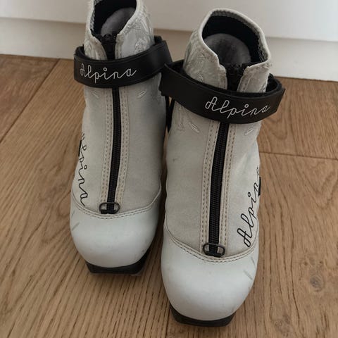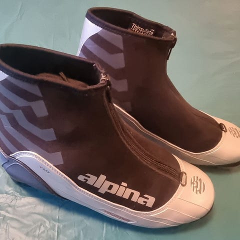 Alpina langrennsko i størrelse 38 med svart og sølv farge. Skoene har glidelåsbeskyttelse foran og skjult snøresystem innvendig. Yttersålen har mønster for feste og stabilitet. Materialet er en kombinasjon av tekstil, plast og neopren. 4 år gammel, men kun brukt på 2 turer.