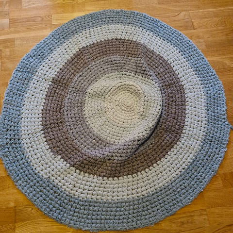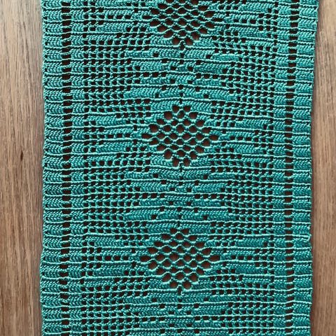 Heklet løper. Mål 86 cm lang uten frynser, x 25 cm bred. Hentes på Sotra. Kan sendes mot porto, evt Fiks ferdig