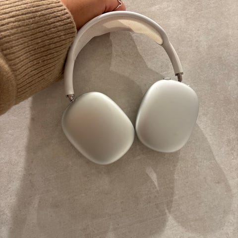 Apple AirPods Max hodetelefoner i sølv farge. Over-ear design med polstret hodebøyle og øreputer. Trådløse hodetelefoner med aktiv støydemping og høy lydkvalitet. Lightningport lader.