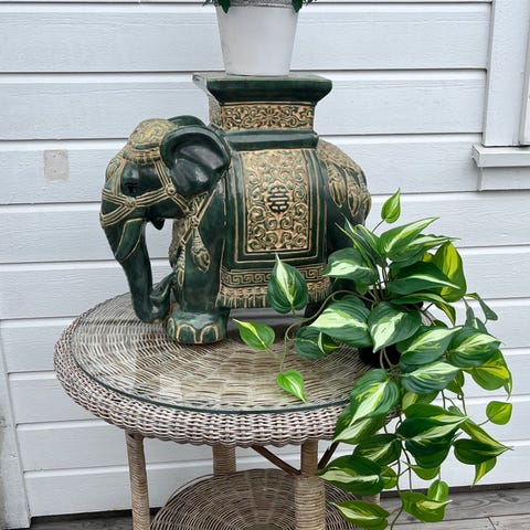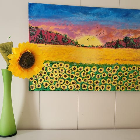 Flott og fargerikt tekstil med stilisert giraffmotiv i varme jordtoner, rødt og grønt. Perfekt som veggdekor, over et bord, på skjenk eller som kunstnerisk blikkfang i stue eller hytte.