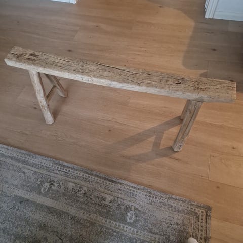 Flott og solid benk fra Home & Cottage uten synlige bruksmerker. Benken er 38,5 cm dyb/bred, 46 cm høy og 187,5cm lang. Kan brukes til spisebord som selges i denne annonsen (https://www.finn.no/recommerce/forsale/item/445847842) eller som selvstendig møbel som avbildet.