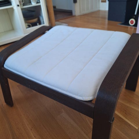 Fotskammelen er pent brukt og fungerer perfekt som ekstra sitteplass, fotstøtte eller liten oppbevaringskasse.