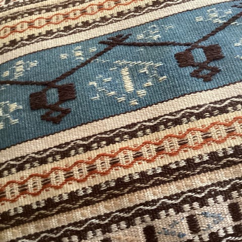 Håndlaget brodert pute med fargerikt mønster på forsiden i klostersøm og ensfarget bakside.