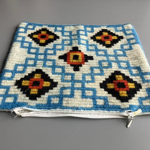 Håndbrodert pute med fargerikt mønster på forsiden i klostersøm og ensfarget bakside.