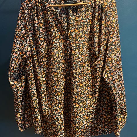 Zizzi bluse i størrelse M for kvinner, laget av polyester. Blusen har et blått mønster med blader og lange ermer med elastiske mansjetter.og er ny men fjernet merke lappene