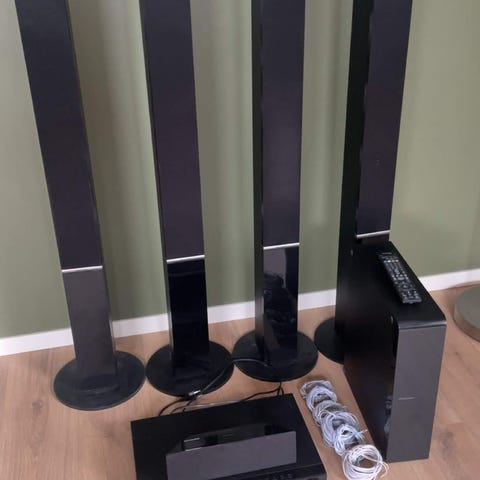LG høyttalere i svart farge. To frittstående høyttalere med tilkoblingsmuligheter bak. Designet for lydavspilling i hjemmemiljø. Må hentes pga størrelse.