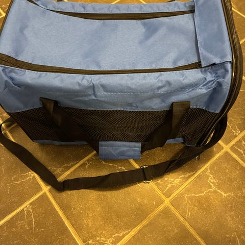 Grått og svart katt bur med åpning på toppen. Buret har håndtak og skulderstropp for bæring. Passer til transport av små til mellomstore dyr.