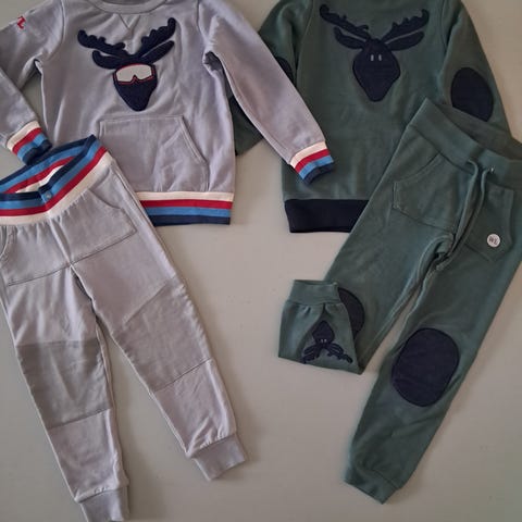 Beige sett er lite brukt, grønn er pent brukt men har noen merker på genseren (mulig etter borrelås?) Se siste bilde for eksempel. Ikke noe man legger merke til med mindre man leter etter.