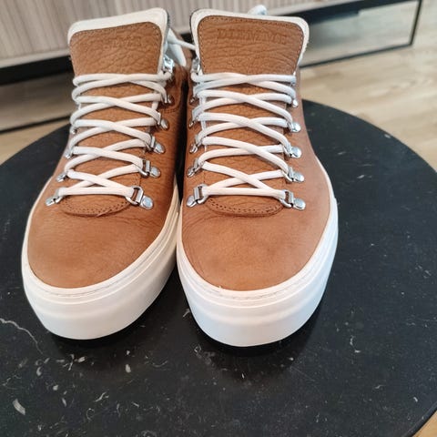 Veldig pent brukte, har ingen slitasje eller svært synlige bruksmerker, bortsett fra den lille skaden foran på tuppen av skoen (se siste bilde), dette synes såvidt når man bruker skoene. Har noe skitten såle, men dette kan nok vaskes. Alt av tilbehør medfølger, inkl kvittering, boks, careofcarl kort osv, kjøpt på careofcarl.no