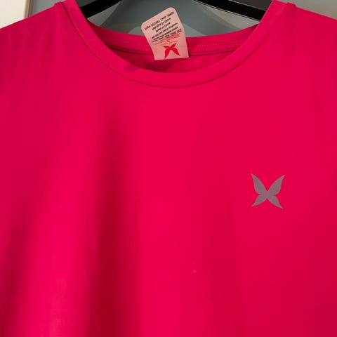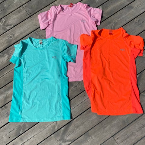 Kari Traa sportsklær for dame i størrelse M. Plaggene har farger i blått, rødt og oransje, og er egnet for ulike sportstyper.