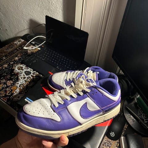 Nike Dunk Low Court Purple selges rimelig. Skoene er veldig pent brukt og har kun blitt brukt noen få ganger. Selger fordi de er ikke helt min stil. Skoene er klare for en ny eier og har masse bruk igjen!