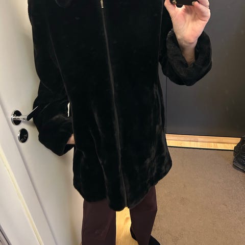 Sort «pels» som passer like godt til bukser som til kjole. Legg merke til den pene skjæringen nederst på kåpen som skaper litt liv i plagget. Kåpen er god og varm, den har hemper og en knapp øverst. Og den har stikklommer på begge sidene.