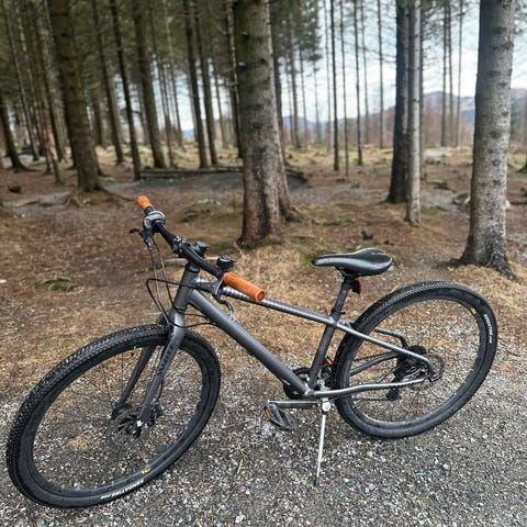 Fuji Nevada 27.5 1.7 sykkel i størrelse XS. Sykkelen har en grå ramme med frontdemper og skivebremser.